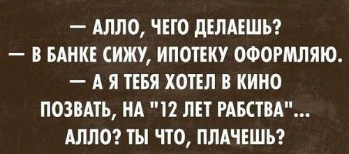 | - Алло, чего делаешь? - В банке сижу, ипотеку оформляю. - А я тебя хотел в кино позвать, на "12 лет рабства"... Алло? Ты что? | |