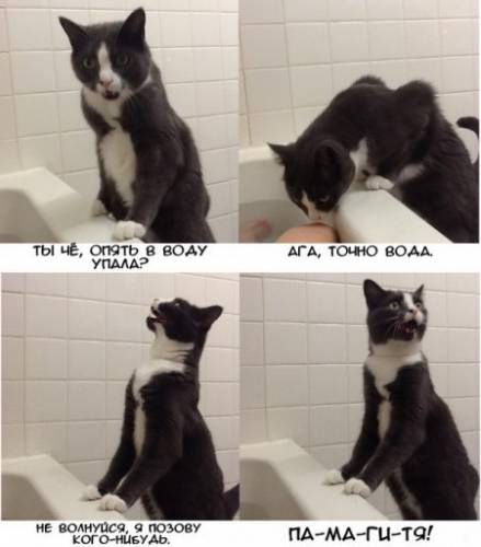 | - Ты чё, опять в воду упала? - Ага, точно вода. - Не волнуйся, я позову кого-нибудь. - ПА-МА-ГИ-ТЯ! | |