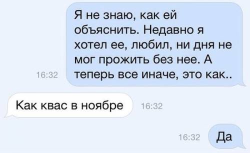 | - Я не знаю, как ей объяснить. Недавно я хотел её, любил, ни дня не мог прожить без неё. А теперь всё иначе, это как... - Как квас в ноябре. - Точно. | |