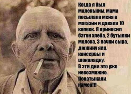 | Когда я был маленьким, мама посылала меня в магазин и давала 10 копеек. Я приносил батон хлеба, 2 бутылки молока, 3 пачки сыра, дюжину яиц, консервы и шоколадку. | |