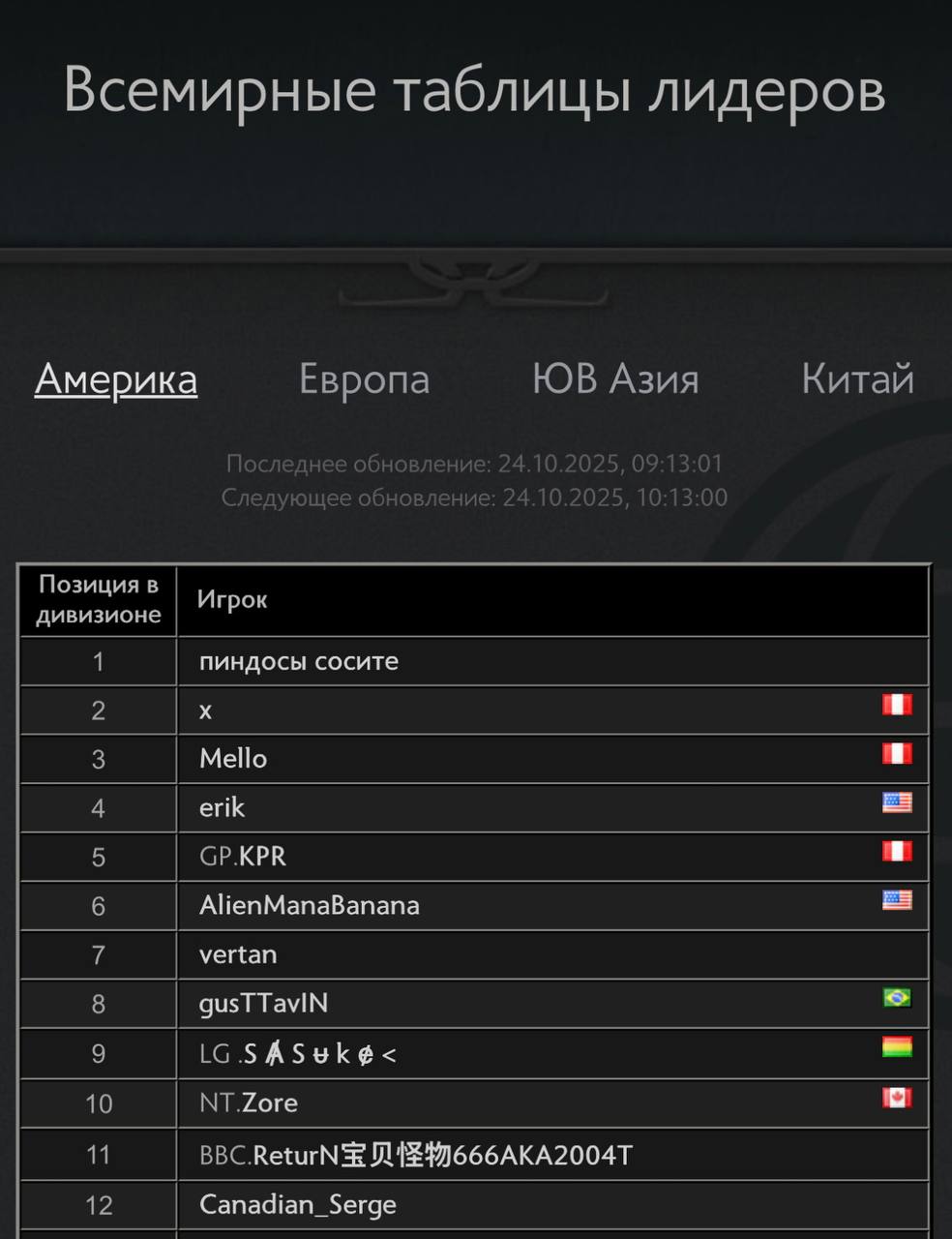 Наа первом месте по рейтингу в регионе Америка по игре Dota 2 находится русскоязычный игрок с ником «пиндосы сосите».
